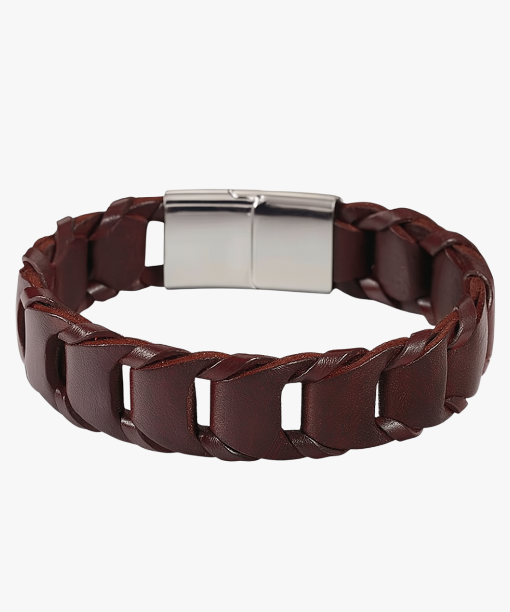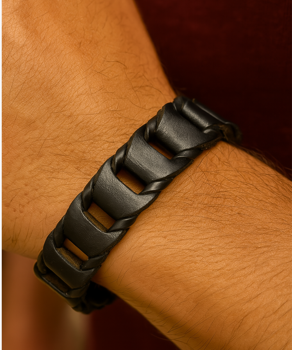 Handcrafted from genuine braided leather, it wraps the wrist with precision and subtle power.